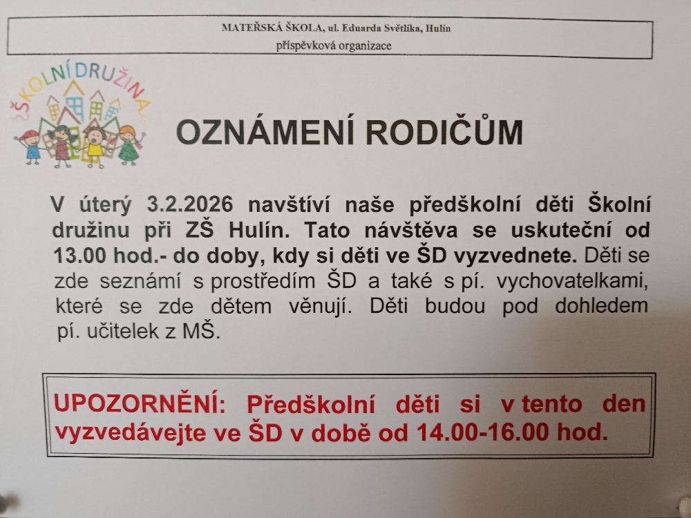 V úterý 3.2. 2026 navštíví předškolní děti Školní družinu při ZŠ Hulín. Tato návštěva se uskuteční od 13:00 do doby, než si své dítě vyzvednete. TENTO DEN SI PŘEDŠKOLNÍ DĚTI VYZVEDÁVÁTE V DRUŽINĚ v 14:00-16:00!!!