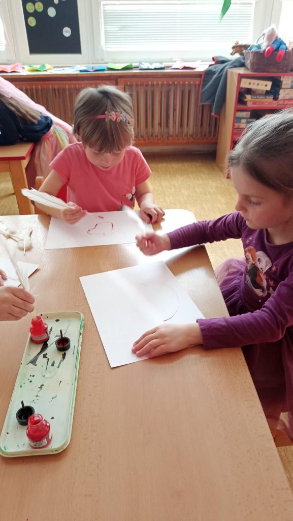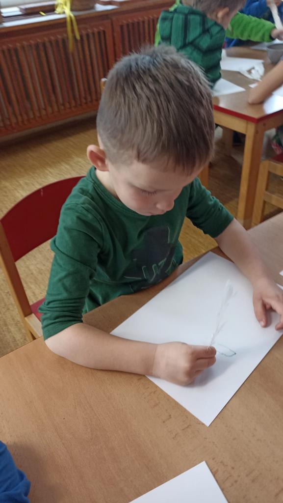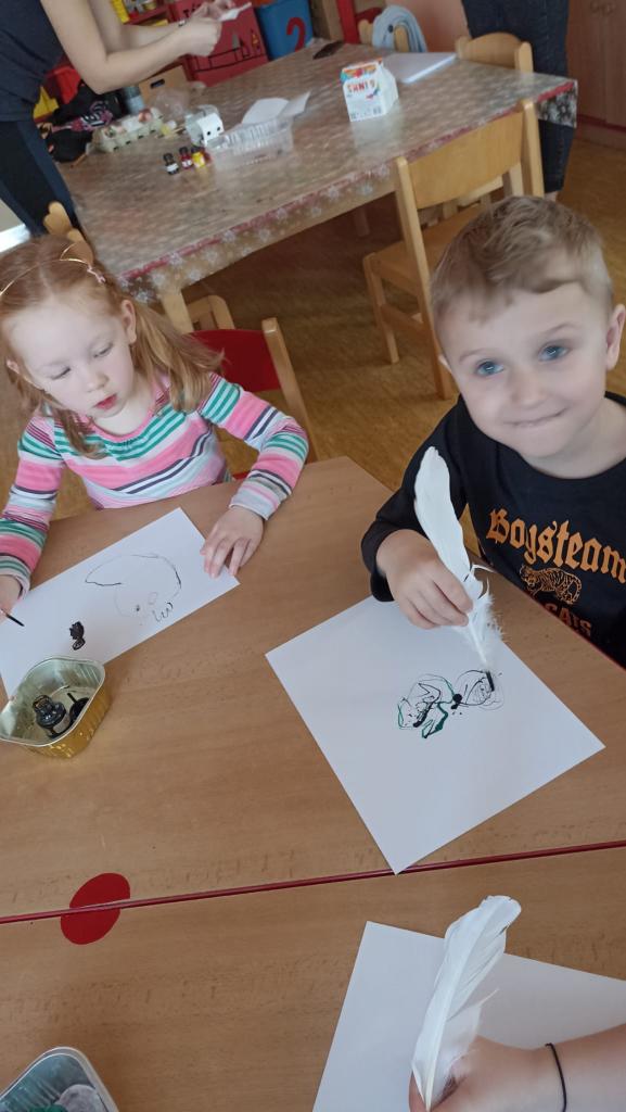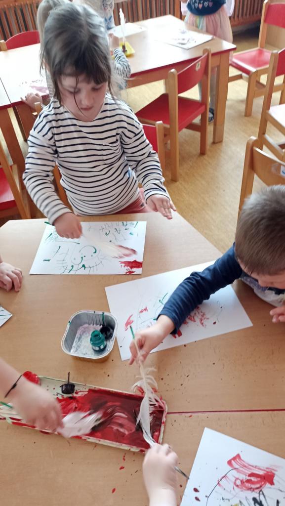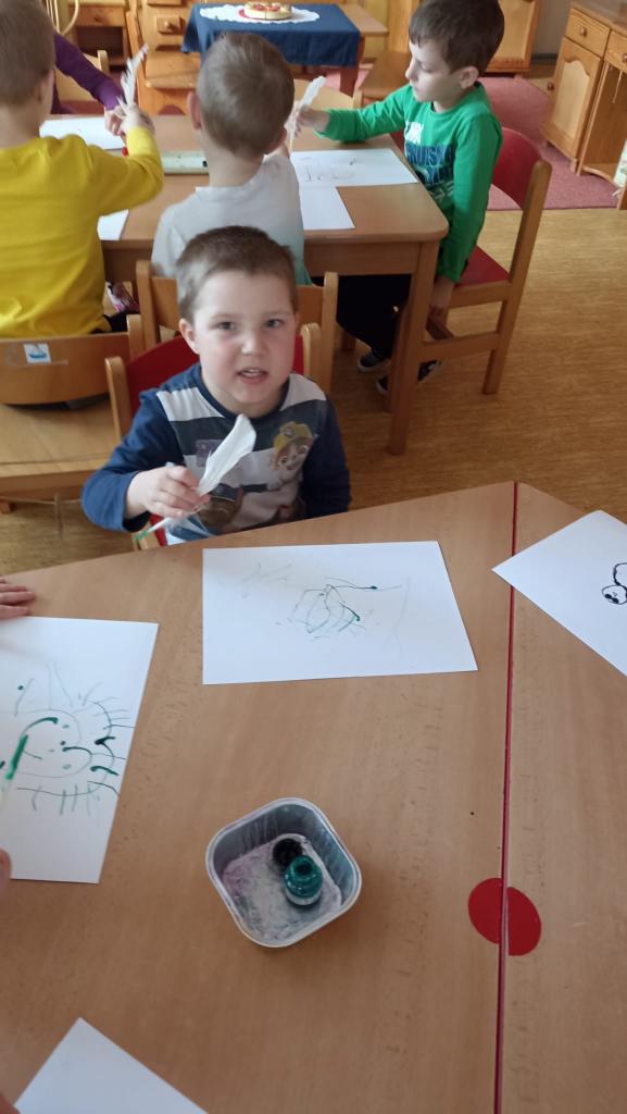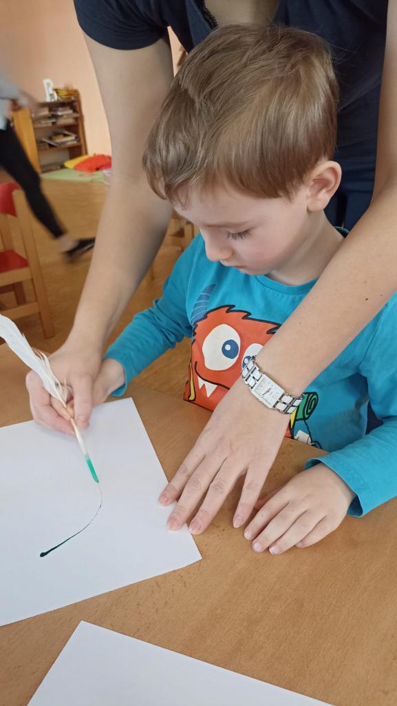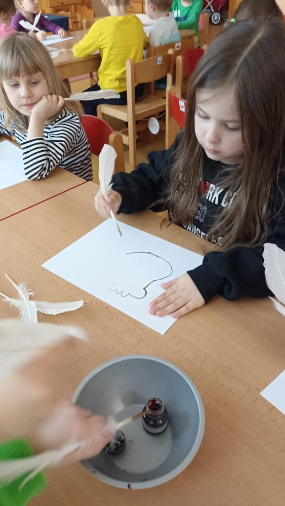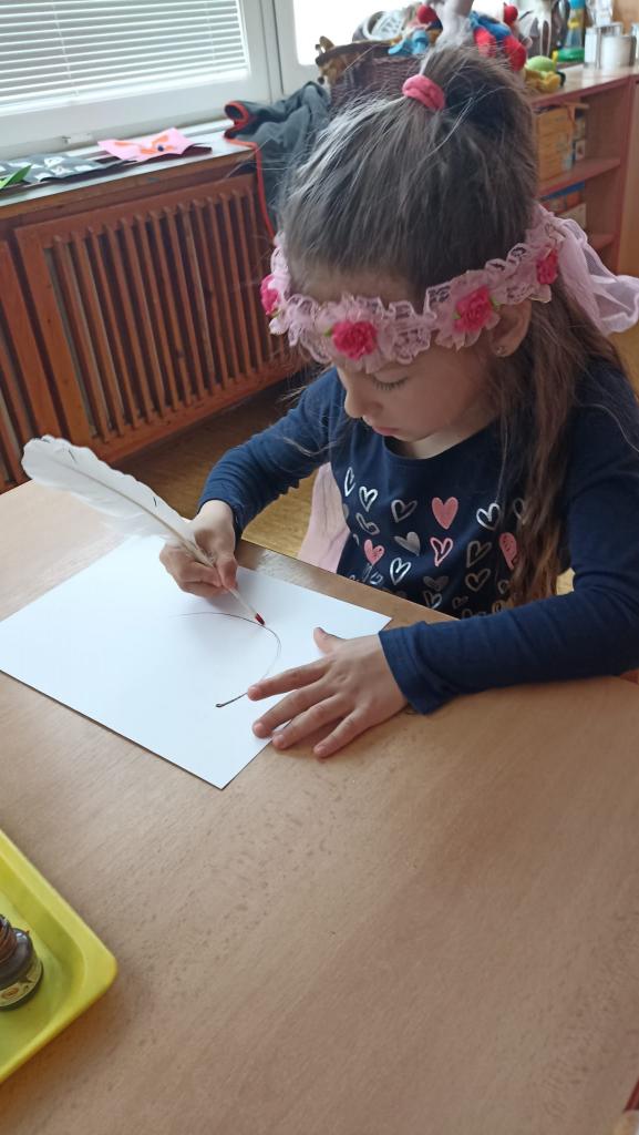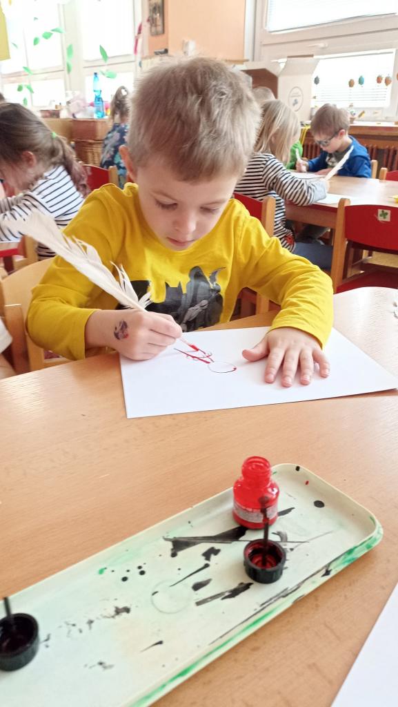 Děkujeme mamince za krásné tvořivé dopoledne. Zkouška kreslení a psaní husím brkem, zdobení velikonočních kraslic.