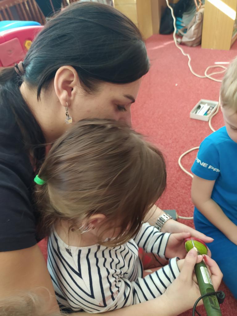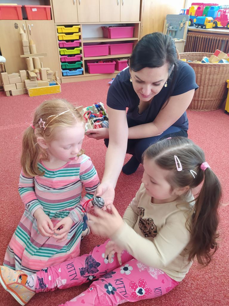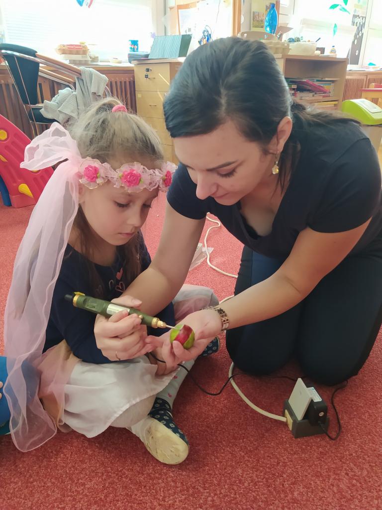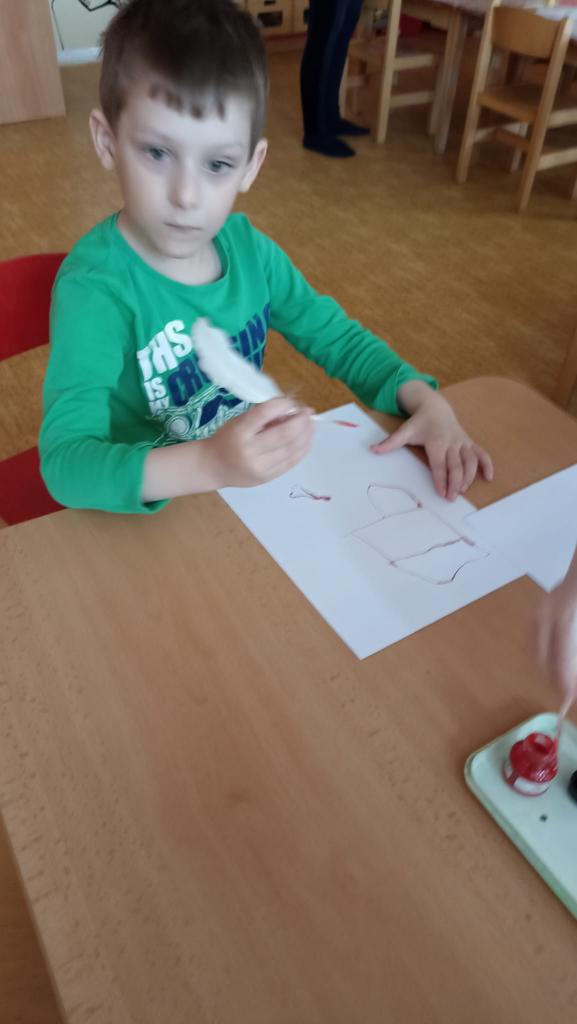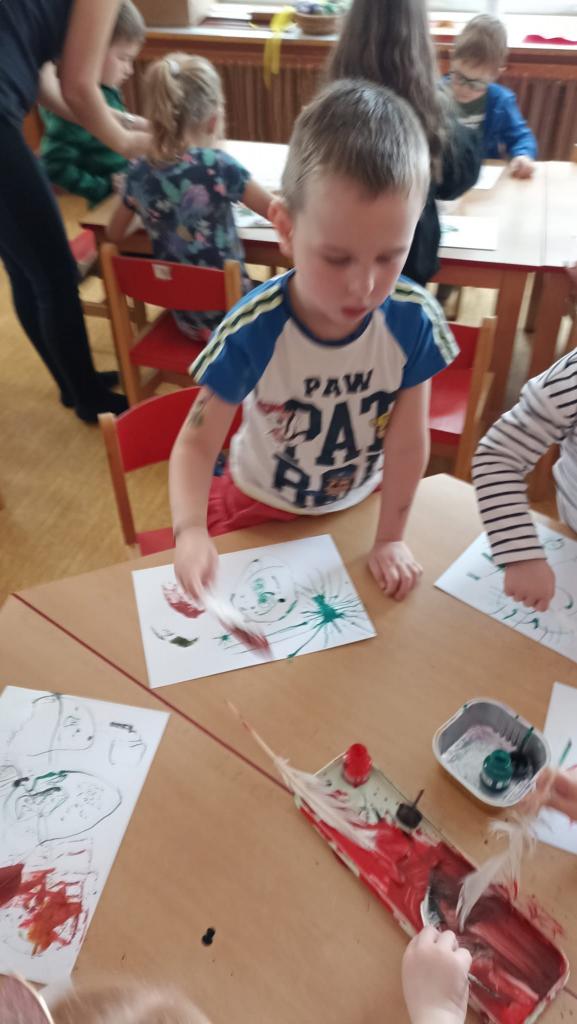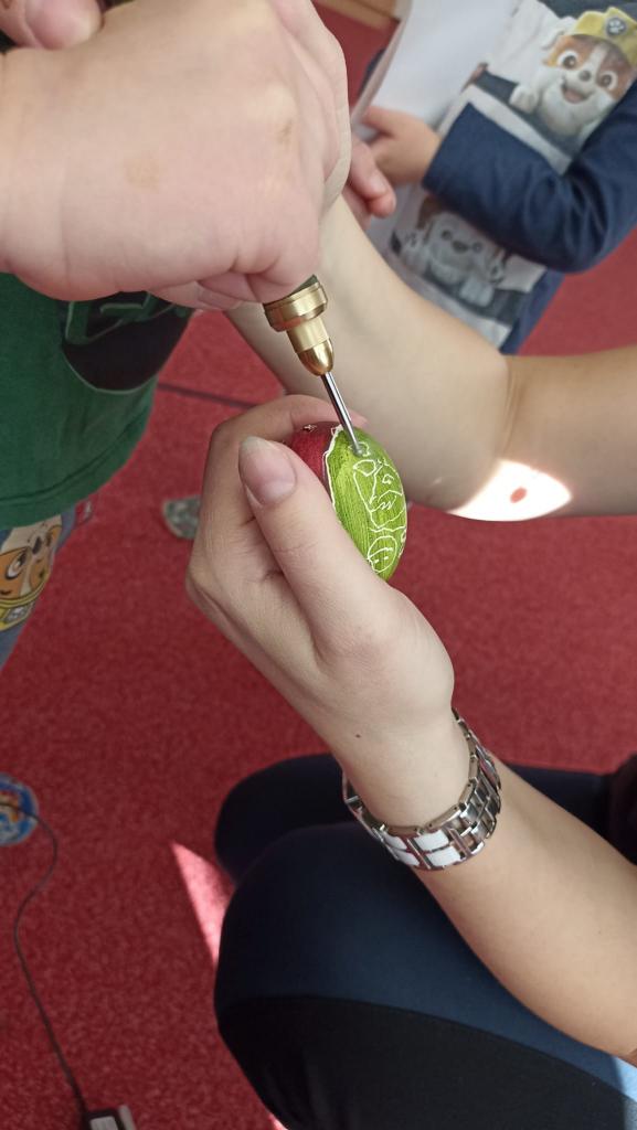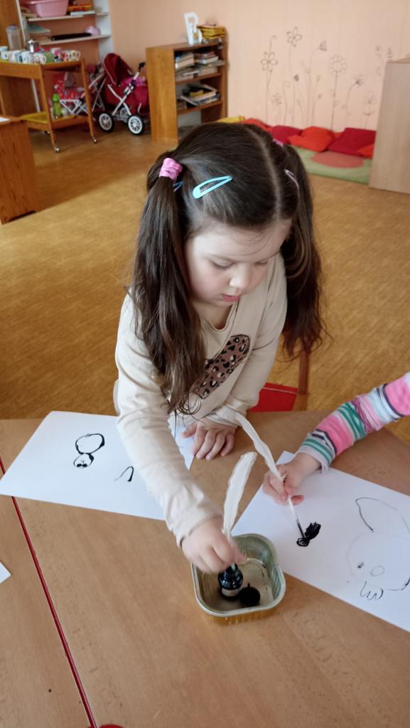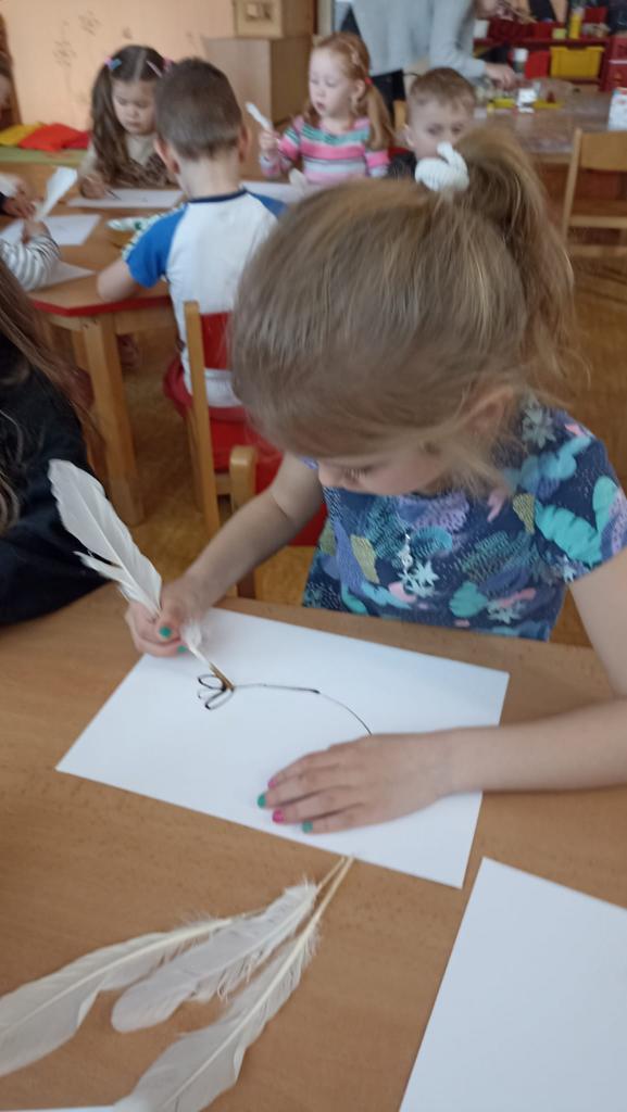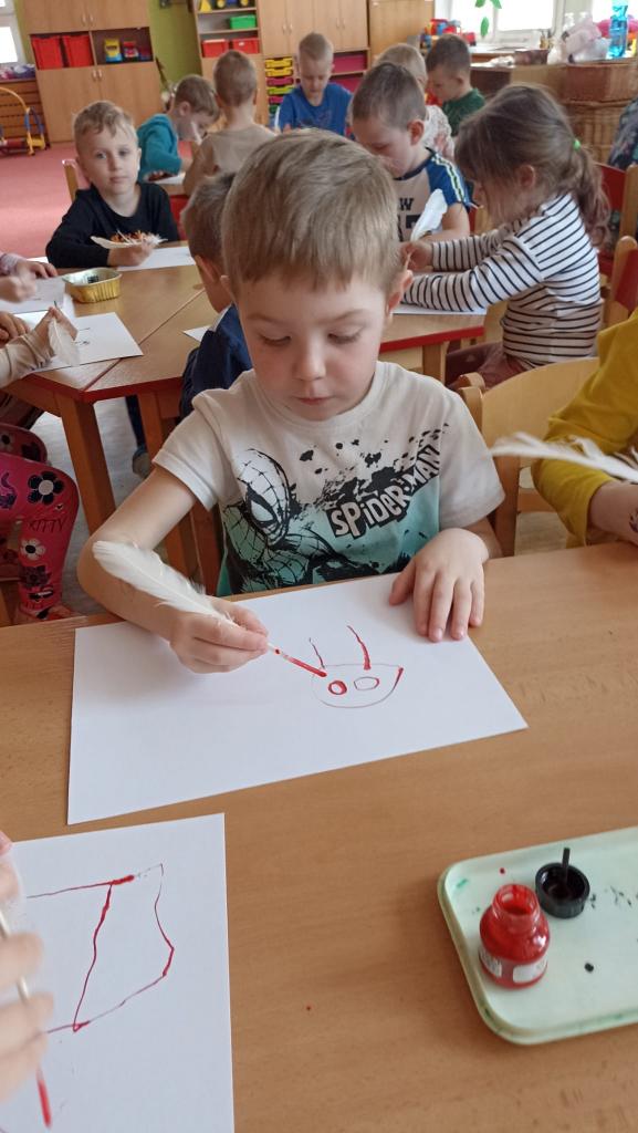 Děkujeme mamince za krásné tvořivé dopoledne. Zkouška kreslení a psaní husím brkem, zdobení velikonočních kraslic.